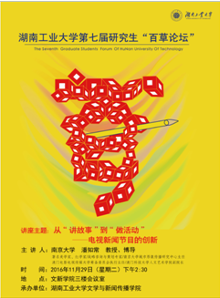 12月5日(星期一)下午3:00,外语学院211报告厅,中国电信传播研究中心主任,钱江学者、北京邮电大学曾静平教授,将做客“百草论坛”,带来题为《媒介融合时代的新媒体素养与职业前程》的讲座。