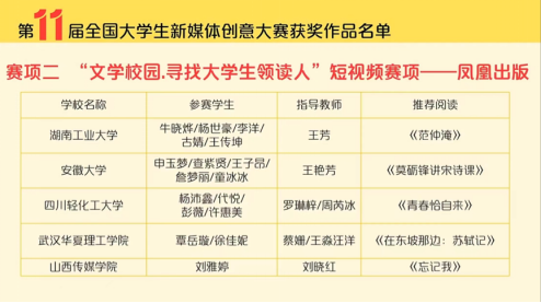 第11届全国大学生新媒体创意大赛获奖名单近日公布。我们新闻系牛晓烨、杨世豪、李洋、古婧、王传坤团队拍摄、制作的《一部大宋“孤勇者”的英雄史诗——领读< 范仲淹>》作品荣获“文学校园·寻找大学生领读人”短视频赛项——凤凰出版赛道一等奖。 本次赛事由中国编辑学会、中国报业协会、中国新闻技术工作者联合会、中国音像与数字出版协会担任指导单位,凤凰出版传媒集团、商务印书馆、北京北大方正电子有限公司等单位共同主办...