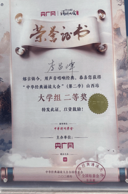 2024年11月16日下午18时,央广网经典诵读大会(第二季)山西站颁奖典礼在山西太原教育电视台圆满落下帷幕。我们播音与主持艺术专业23级学生李昌峰在大学组中斩获二等奖,取得了骄人的成绩。中华经典诵读大会,是由中央广播电视总台央广网独家策划的大型文化展演活动,是全国文化类IP,旨在引导、鼓励全社会共同诵读中华经典,深入推进全民阅读,共同建设“书香中国”。本大赛由中央广播电视总台 中央网信办主办 ,由cctv10科教...
