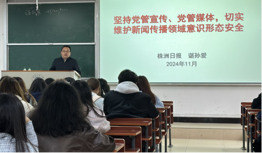 新闻专业要培养怎样的人?互联网时代,新闻人才如何做好意识形态工作?11月19日下午,株洲日报社党组书记、社长、总编辑谌孙爱走进大学课堂,为我们新闻专业2023级本科生带来了一场题为“坚持党管宣传,党管媒体,切实维护新闻传播领域意识形态安全”的讲座。 谌社长以深入浅出的方式阐释“意识形态的基本概念”,指出新闻传播工作其实就是意识形态工作。结合公益宣传、项目建设推广、社会科学论坛、媒体传播等具体的实例分析,...