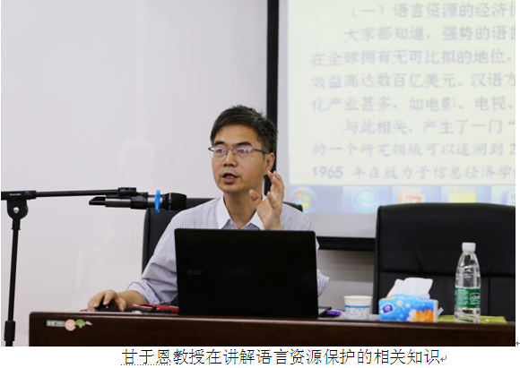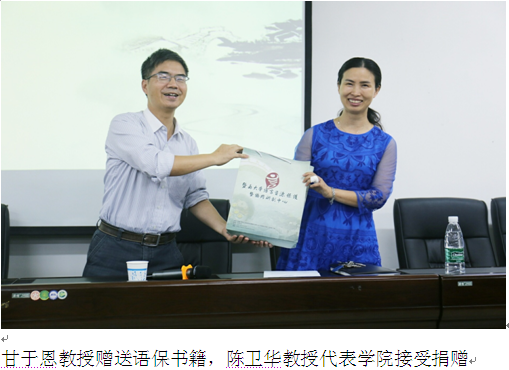 身兼《羊城晚报》特约作者的甘于恩教授,与乔全生教授一样在方言学研究上也颇有建树。他的学术报告以广东省情为基础,从“语言资源观”、“广东的语言资源”和“语言资源保护的策略”三个方面展开,论述了语言既是交际工具和思维工具、更是“一种特殊的社会资源”的语言资源观,全面阐述了语言资源的经济价值和文化(社会)价值,深入地讲解了语言资源保护的相关基本策略。通过列举国内外保护方言的案例,由此及彼地映射出我国在方言保护领域的现状,让在场的听众深受启发。甘教授强调,方言作为人类的一种文化资源,其功能并不只在于交流,每一种语言都代表了一段历史一段文化,是独特而不可复制的。尤其是在当前多种语言濒危的情况下,语言资源的文化、社会价值让语言资源保护成为一种趋势。他指出,只有抓紧制定我国语言资源保护近期、中期和长期规划,改变目前自上而下的基本态势,形成语言资源保护自上而下和自下而上的对流态势,并利用新媒体拓展语言资源保护的广度和深度,从使用人群入手,根本上改善语言资源的“断流”现象,才能切实推进和搞好我们的语言资源保护工作,为中华文化的传承发展和中华民族的伟大复兴作出贡献。甘于恩教授的报告让在场的师生领略到了语言学术研究的魅力以及语言资源保护的重要性、必要性与紧迫性。