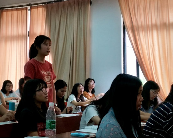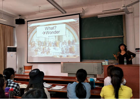 在讲述西方哲学思想起源时,王教授重点提出对中国教育制度的期待,她希望中国学生更应该出于“猎奇”的思想去学习,同时王教授也鼓励中国学生要“开口说”,学会很好地表达自我。此外,王教授还分享了多起国外授课的实例,如学习《道德经》时会要求学生们携带各种不同版本,让学生们自主翻译和理解,这很大程度上提高了学生们在学习上的主观能动性。王老师表示,这一学习过程事实上已是一门解读学,而每一个人可以通过某一个字的翻译体现个人的世界观。
