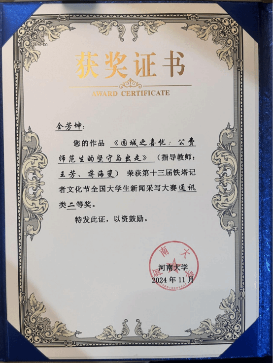 全芳坤同学的作品《围城之喜忧:公费师范生的坚守与出走》荣获本届大赛通讯类二等奖。该作品由我们新闻系教师王芳和蒋海斐指导,首发于《视线TheView》公众号。