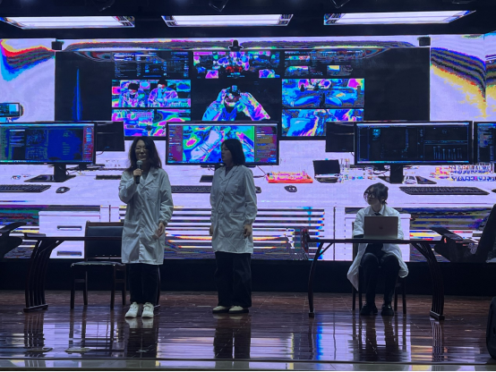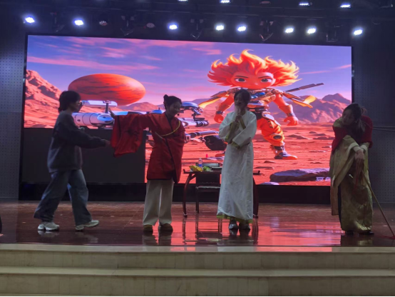 在课程学习期间,学生们深入探索了戏剧剧本创作的各个方面。从故事构建到角色塑造,从情节发展到对话撰写,他们在指导老师曾慧林指导下逐步掌握了创作的精髓。本次汇报活动中,呈现出的作品类型丰富多样,共演出六个剧目:《神仙的期末周》《代号马鞭草》《非职业替身》《“巾巾”计较》《监控》《谢谢你,点亮我》。每一个剧本背后都有着学员们独特的思考和深刻的情感表达:《神仙的期末周》借助各路神仙,用身份“互文”的手法反映大学生苦于繁重学业的现象;《代号马鞭草》中利用拯救马鞭草的故事,呼吁保护自然环境和社会环境的重要性,传达了传承和发展中华优秀传统文化的主题;《非职业替身》用戏谑荒诞而又不失真实的故事向我们揭开大学生代课的神秘面纱;《“巾巾”计较》通过“判官”审判,拷问新曝光的各品牌卫生巾的诸多问题,引发对于女性卫生安全的思考;《谢谢你,点亮我》体现的则是一段关于人生选择、心灵触碰与观念转变的感人故事。演出中,同学们生动地展现了各自作品的魅力,他们精彩的表演和富有感染力的创作,赢得了在场观众的阵阵掌声和高度评价。