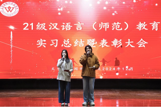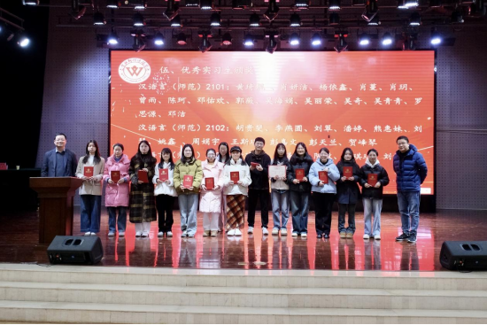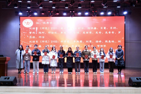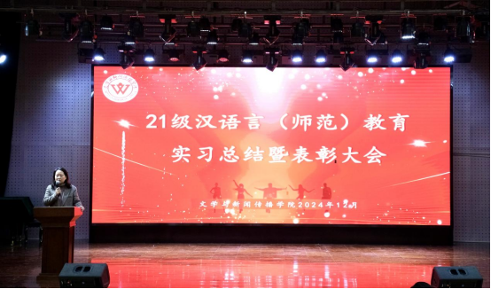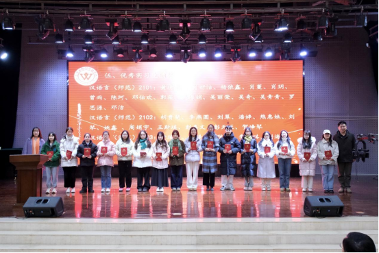 12月24日下午,中文系2021级汉语言文学(师范)教育实习总结暨表彰大会在文新楼401演播厅召开,betway必威中国院长王丽萍、党委书记刘国民、副院长蒋军凤、党委副书记陈家驹、副院长雷晓艳、副院长罗莉出席总结表彰会并为21级汉语言(师范)黄琦靓等43位“优秀实习生”颁奖,中文系全体教师、2021级汉语言文学(师范)全体实习生以及2022级汉语言文学(师范)的部分公费师范生参加大会。大会由邓佑欢、江轩两位同学主持。
