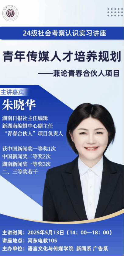 5月13日下午,湖南日报社主任编辑、新湖南编辑中心副主任朱晓华应邀来到必威官方首页官网,为新闻传播学子带来一场题为《青年传媒人才培养规划——兼论青春合伙人项目》的精彩讲座。