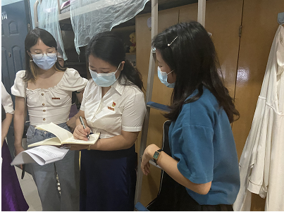 院党委副书记文春风、学工办主任刘莎、辅导员高子华、兼职辅导员陈美臻走进新生宿舍,与同学们亲切交谈,询问她们家乡分别在哪里、就读的专业班级、入校报到的感受等。请同学们充分理解当前疫情防控期间,学校采取“非必要不外出”的特殊管理要求,做好个人健康防护;女生在外求学要注重提高安全意识和自我保护意识,遇到困难及时和辅导员老师沟通交流寻求支持与帮助;鼓励大家以积极的心态和良好的精神面貌积极融入文新大家庭。
