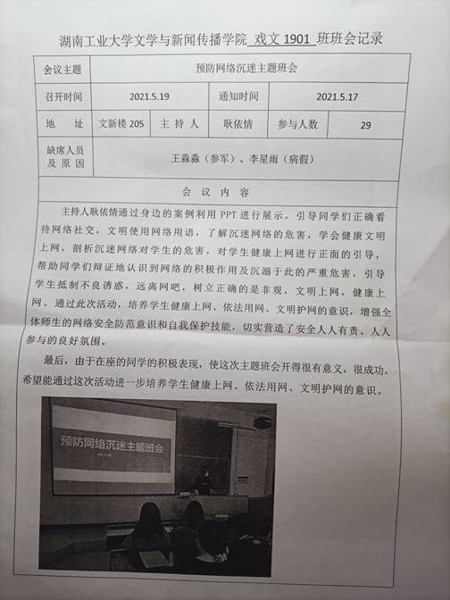 本次班会主要以线下形式展开,通过各班心健委员或班长进行讲解,从当今人们使用网络的现状,到通过事例来说明网络沉迷的后果和危害,最后倡导同学们健康上网,适度使用网络。其一,加强了各班同学的预防意识,认识到了网络上可能存在的不安全隐患。其二,更加紧密了心健委员、班长和各班学生,心健委员与心健工作部门的联系。其三,此次班会课的召开,使得同学们深刻明白要理智对待网络诱惑,抵制不良思想的侵蚀,并学会在虚拟的网络世界中保护自己的利益,真正做到理性上网,做网络的支配者,而不是被网络所支配。