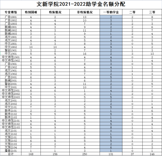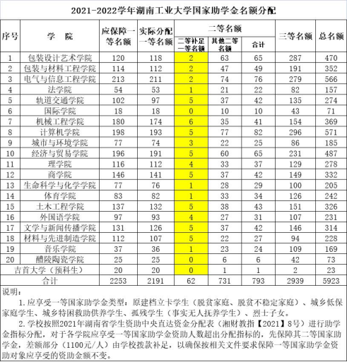 根据湖南省学生资助管理中心下达我们的名额指标,我们2021-2022学年一等助学金总名额为2253个,实际分配一等名额为2191个;二等补足一等名额为62个,其他二等助学金名额为731个,共793个;三等助学金总名额为2939个。资助中心统筹考虑各学院在校学生人数、重点资助对象人数和学生家庭经济困难程度等因素,将湖南省学生资助管理中心下达我们的国家助学金金额按比例计算分配至各学院。学校学生资助管理中心分配给我们的国家助学金名额应保障一等名额131人,实际分配一等名额126人;二等补足一等名额5人,其他二等名额37人,共42人;三等助学金名额146人,一共是314个名额。