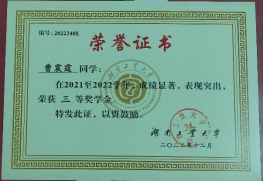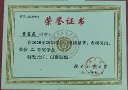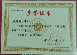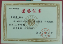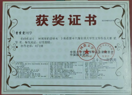 青春是我们一生中最宝贵的时光,也是我们人生发展中的关键所在。正值青春的学子,需要珍惜每一寸时光,把握每一缕光阴。自进入大学以来,曹震霆除专注于学习以外,也积极地参加与专业密切相关的各项活动。在第十六届全国大学生文学作品大赛中,他的回顾童年岁月,叙写旧时记忆的散文《时间里的悬铃木》获大赛二等奖。在湖南省2021年度“湘观影”“光影铸魂”“光影育人”影评征文大赛中,他的作品《<中国医生>:半虚构式的真实再现》又获大赛三等奖。该影评抓住了电影《中国医生》中的真实元素,探讨了艺术作品中真实现状的再现。而在2022年湖南省普通高等学校“一校一书——经典、精读、经世”阅读活动、湘潭市第十一届“湘灵杯”文学创作大赛、郴州市双拥主题文艺作品征集活动中,他的作品又依次获得“优秀读书心得奖”、文学创作大赛三等奖以及征集活动优秀奖。除此之外,在其它各类活动中,曹震霆也获得了斐然的成绩。通过参与各类活动,曹震霆既开拓了自身的眼界,也锤炼了个人的能力,向着更优秀的自己不断进发。