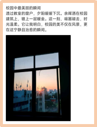 “瞬间捕捉:情绪主题摄影展”以“校园中最____的瞬间”为开放式命题,鼓励参与者通过手机镜头进行“正念观察”。百余幅作品中,既有“图书馆角落独自沉思的身影”(配文:“偶尔的孤独也是自我对话的契机”),也有“夕阳下的教室”(配文:“校园的美在于宁静中的治愈”)。此环节则希望利用心理学中的“摄影疗法”,通过取景框聚焦细节的过程,帮助同学们提升对当下情绪的觉察力。