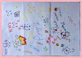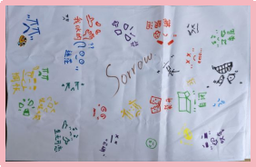“绘制情绪:缤纷表情涂鸦墙”环节以心理学“艺术疗法”为理论支撑,现场设置“喜、怒、哀、乐”四大情绪分区画布。参与者通过彩色马克笔、贴纸等工具,将抽象情绪转化为可视化符号——愤怒被描绘为燃烧的红色火焰,忧郁凝结成飘落的蓝色雨滴,快乐绽放为跳跃的黄色星芒。通过这个环节希望可以将情绪外化为具象创作的过程,降低同学们心理压力水平。