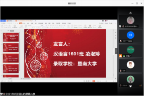 第二位发言人是来自于汉语言1601班的凌淑婷,成功考入暨南大学,她提到要提前明确自己要考的方向,可以通过知乎等平台寻找到自己目标学校并且考研成功的学长学姐,了解到学校的情况。