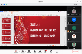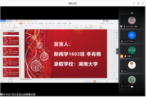 第三位发言人是来自于新闻学1601班的邹敏同学,成功被武汉大学录取,邹敏同学选择的是进行跨专业考研,考入武汉大学的社会学院。因此在前期她拿到了所考专业的书籍,整整梳理了两遍。邹同学个人是属于学习进程比较慢的人,因此她尤其注意不去问其他同学的学习进程,以免打扰到自己的学习进度。要注意多刷真题,多练习自己的手感。