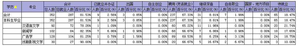 我们汉语言文学、新闻学、戏剧影视文学以及广告学专业特色鲜明,优势突出,学生求职时职业选择多样化,除了选择考研、公务员、教师等,还可以进入传媒广告公司或者社会教育培训机构等工作单位进行工作。在这样的就业大环境下,我们鼓励和积极组织毕业生参与校园周招聘会、大型校园招聘会、行业招聘会,致力于为学生营造一个良好的就业氛围,提供良好的就业机会。