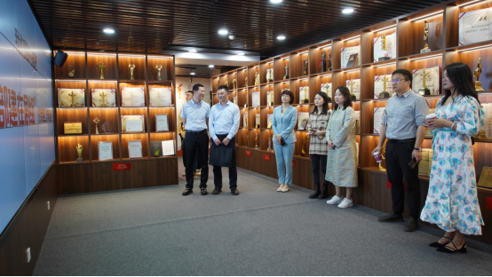 紧接着,考察团一行参观了位于21楼的展厅,这里陈列着潇湘电影集团丰富的影视作品和荣誉奖章,见证了集团辉煌的历史和成就。在随后的座谈会上,双方就影视产业发展趋势、人才培养需求等问题进行了深入交流。