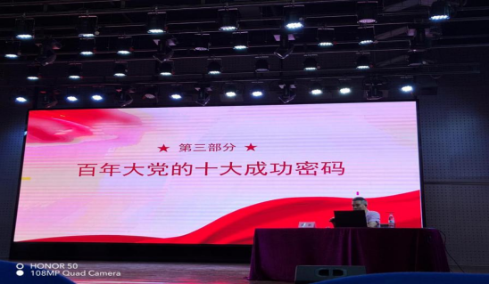 宣讲会上,胡帆教授就“感悟百年大党的成功密码”这一主题做宣讲,胡教授从党的十九届六中全会主要内容概述、学习《决议》要把握好九个问题以及百年大党的成功密码三个部分为出发点为我们生动的讲述了中国共产党的百年奋斗史。胡教授强调:“党的成功密码就是一切为了人民,一切依靠人民,不论是抗日战争的胜利、解放战争的胜利、脱贫攻坚战争的胜利还是抗击新冠疫情取得的战略成果都是党团结带领人民共同奋斗取得的伟大胜利。”