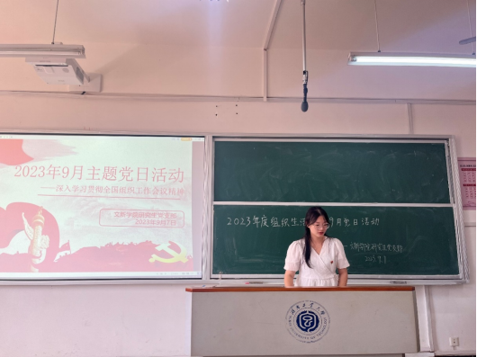 2023年9月26日下午14时,我们研究生党支部于文新503教室顺利开展主题为“深入学习贯彻2023年全国组织工作会议精神”的九月份党日活动。参加此次活动的有院党委副书记陈家驹、研究生党支部书记肖靓莎以及研究生党支部全体成员,主要采取线下和线上会议结合的方式进行学习教育。