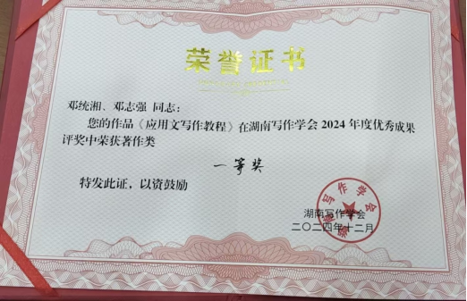 我们邓统湘博士主持了大会的第一场主题发言,她和邓志强老师主编的《应用文写作教程》获得了湖南写作学会2024年度优秀成果评奖著作类一等奖。