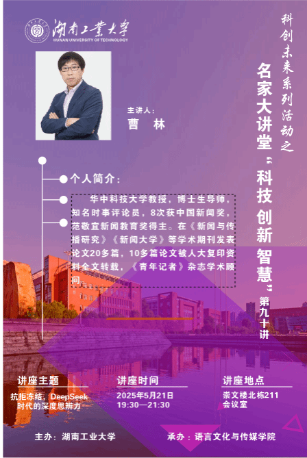 曹林为华中科技大学教授,博士生导师,知名时事评论员,曾8次获中国新闻奖,范敬宜新闻教育奖得主。讲座由副院长雷晓艳教授主持,新闻专业23级和22级学生聆听了讲座。