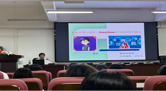 为了论证思辨的重要性,曹老师让同学们对“羞耻”、“公平”等词汇的理解进行互动。结合“大学给家长寄成绩单”、“学校争高铁站”、“高铁上大声喧哗”等案例,指出思辨需要跳出“深度障碍物”。在“宇树科技王兴兴评教育体系”、“董小姐医学论文”等案例的分析中,曹老师进一步告诫新闻学子DeepSeek时代思维解冻的密码:警惕“丝滑”,拒绝“闭环”。曹老师深入浅出的论述赢得现场掌声不断。