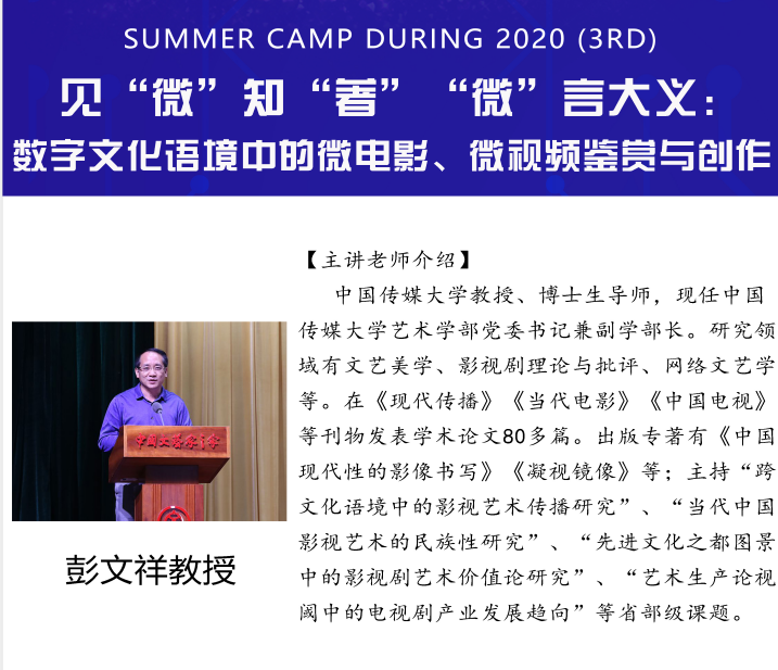 随着互联网的发展,媒介生态和文化艺术生态不断变迁。微电影、微视频作为一种艺术创作形式,也迎来了巨大发展。在创作微电影、微视频时我们应考虑哪些问题?一部微电影、微视频奇在哪里,新在何处,巧在哪里?就艺术创作与艺术鉴赏等诸多问题,8月4日上午,中国传媒大学彭文祥教授为“智能媒体时代的广告与影视传播”研究生暑期学校的学员们带来了一场主题为“见‘微’知‘著’,‘微’言大义:数字文化语境中的微电影、微视频鉴赏与创作”的学术讲座。