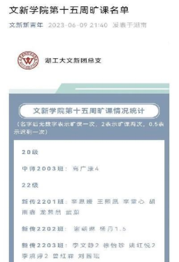 通报与处分:团学会学习部每周将考勤结果整理,及时在崇文楼宣传栏张榜公示进行线下通报,以及在文新新青年公布名单。违纪者严格按照《必威官方首页官网学生违纪处分规定》进行处理。