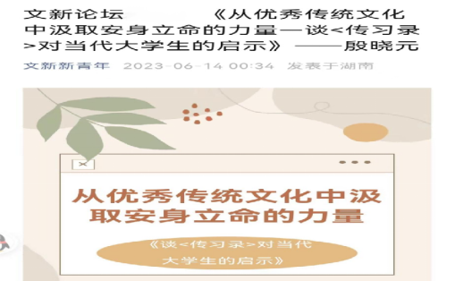 6月15日晚上,殷晓元副校长来我们进行关于《从优秀传统文化中汲取安身立命的力量—谈<传习录>对当代大学生的启示》的讲座,结合经典文本《传习录》,阐释中华优秀传统文化中的根与魂。讲座后,文新学子从中学习了中华优秀传统文化包含许多人类文明的生存智慧,让学生更好弘扬中华优秀传统文化,提高智慧素养和精神境界。