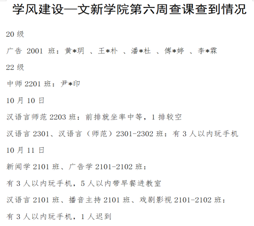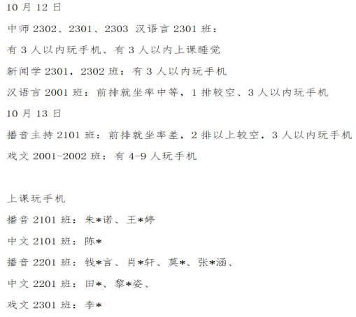 本周查课查到过程中,大部分班级前排就坐率和抬头率较高,同学们认真听课、积极思考,严格遵守课堂纪律,学习状态良好,课堂学习氛围浓厚,但仍存在小部分同学未遵守课堂规定,出现迟到、旷课、带早餐进入教室、上课玩手机的情况。
