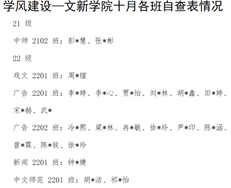 自查表收集工作让学院及时了解学生在上课过程中的出勤情况、学习状态以及思想动向。通过对收集到的数据进行分析,学院老师发现10月份部分各班在课堂纪律、学生出勤等方面存在的问题,并及时公示,提醒学生认真遵守课堂要求,同时制定解决措施和方案,切实提升学风建设工作的质量和水平。