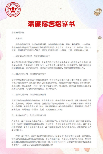 廉洁,意为公正不贪,公平无私。一个清廉的宿舍环境,不仅能够培养我们的道德品质,更能让我们在日常生活中懂得自我约束,树立正确价值观。 在此我们向同学们发起倡议: