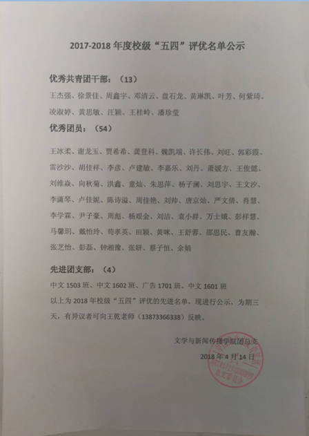我们2017-2018年度“五四”评优评先大会在领导和老师们的认真组织下,在主席团成员、各部门部长及各班班长团支书的积极参与下取得圆满成功。